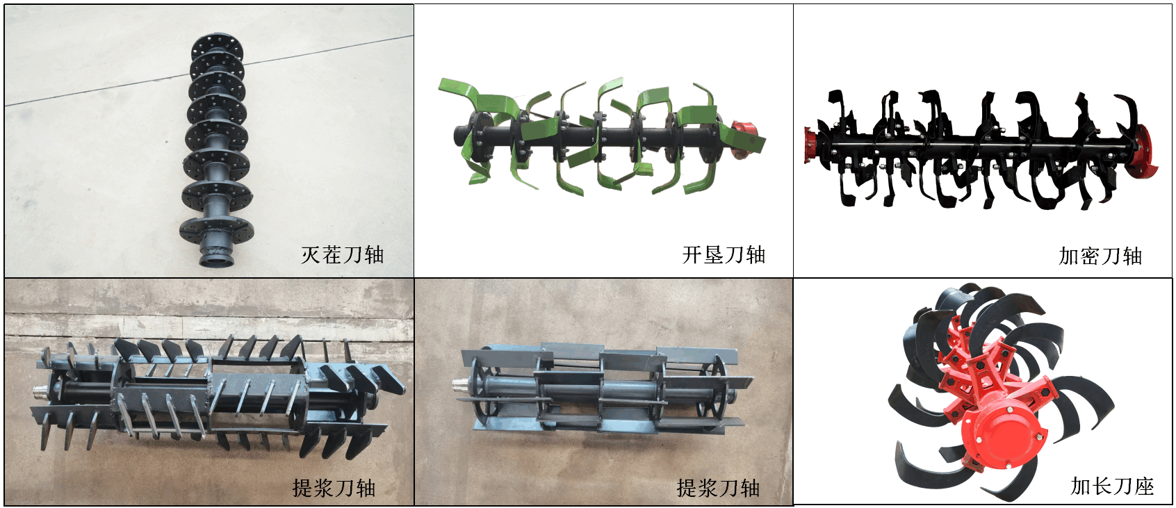 可根據(jù)水旱田及農(nóng)藝需要配制:滅茬刀軸、開(kāi)墾刀軸、加密刀軸、提漿刀軸、加長(zhǎng)刀座