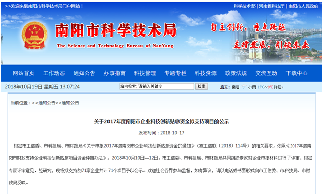 根據(jù)市工信委、市科技局、市財政局《關(guān)于申報2017年度南陽市企業(yè)科技創(chuàng)新貼息資金的通知》(宛工信聯(lián)〔2018〕114號)的相關(guān)要求,依照《2017年度南陽市財政支持企業(yè)科技創(chuàng)新貼息項(xiàng)目資金評審辦法》,2018年10月10日—12日,市工信委、市科技局、市財政局共同組織專家對企業(yè)申報材料進(jìn)行了評審,根據(jù)專家評審意見,經(jīng)研究,現(xiàn)將擬支持的71家企業(yè)共計71個項(xiàng)目予以公示。歡迎社會各界參與監(jiān)督,如有異議,請以電話或書面形式向市工信委、市科技局、市財政局反映。