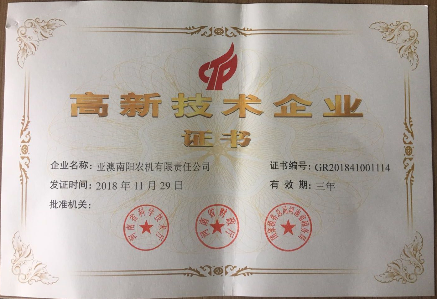 由河南省科學(xué)技術(shù)廳、河南省財(cái)政廳、國家稅務(wù)總局河南省稅務(wù)局,聯(lián)合頒發(fā)“高新技術(shù)企業(yè)”認(rèn)定證書,標(biāo)志著亞澳農(nóng)機(jī)在研發(fā)和創(chuàng)新方面的能力,得到了國家相關(guān)部門的肯定與認(rèn)可。