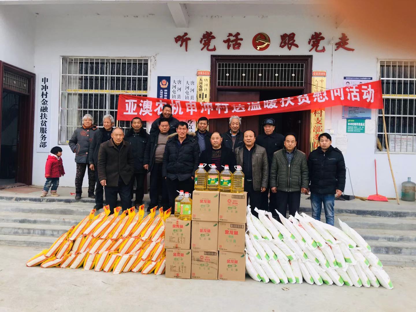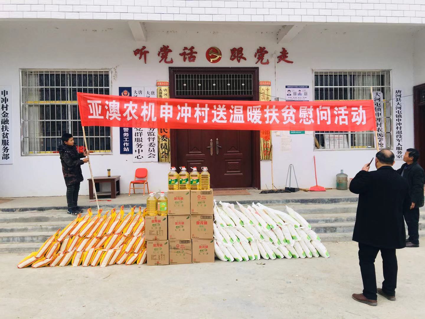 為積極貫徹落實(shí)唐河縣委縣政府”百企幫百村”的扶貧工作精神,履行企業(yè)社會(huì)責(zé)任,按照縣扶貧辦工作統(tǒng)一部署,亞澳農(nóng)機(jī)結(jié)合對(duì)口幫扶的申沖村實(shí)際情況,因地制宜,統(tǒng)籌規(guī)劃,務(wù)求實(shí)效,在2018-2019年開(kāi)展了一系列的扶貧幫困工作。