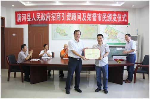 9月1日,唐河縣人民政府舉行招商引資顧問及榮譽(yù)市民頒發(fā)儀式。縣長(zhǎng)周天龍、政府副縣長(zhǎng)王天清、縣產(chǎn)業(yè)集聚區(qū)黨工委書記王全廣等出席儀式。